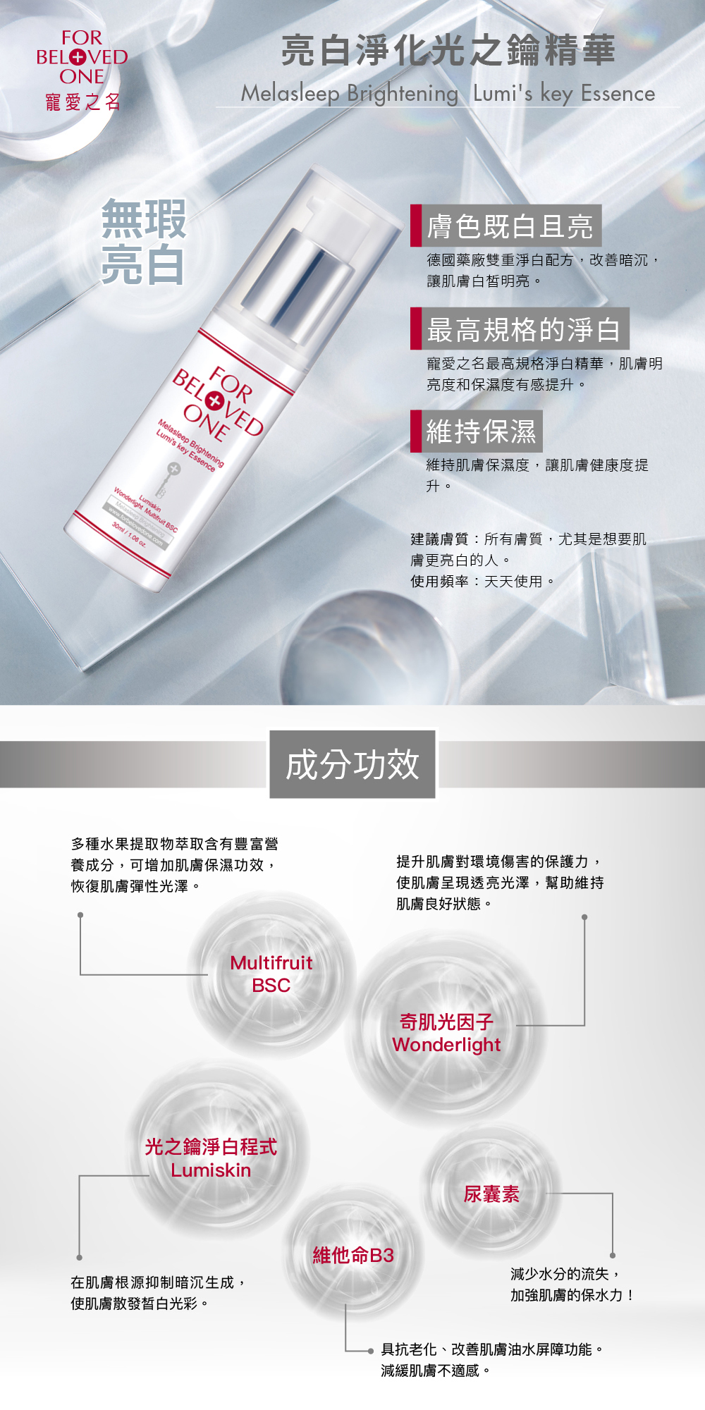 ③Multifruit BSC含多重果酸植萃,深入肌底,完美淨白、無瑕透亮每吋肌膚。