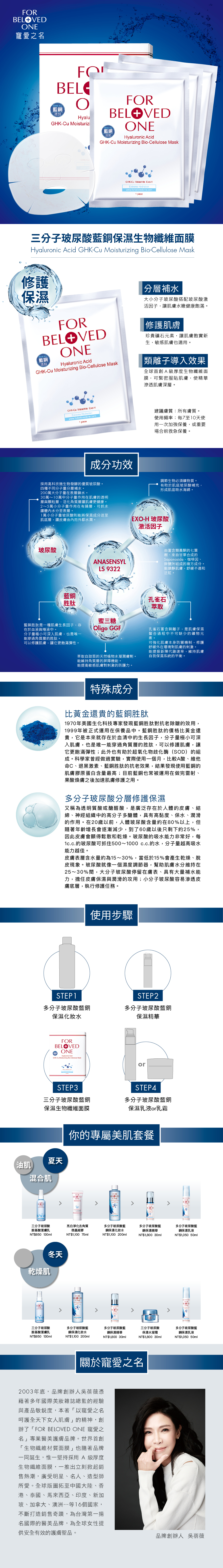 主成分:藍銅胜肽GHK-Cu、孔雀石Malachite、大分子玻尿酸Sodium Hyaluronate、小分子玻尿酸Hyalo-Oligo、玻尿酸激活因子Exo-H