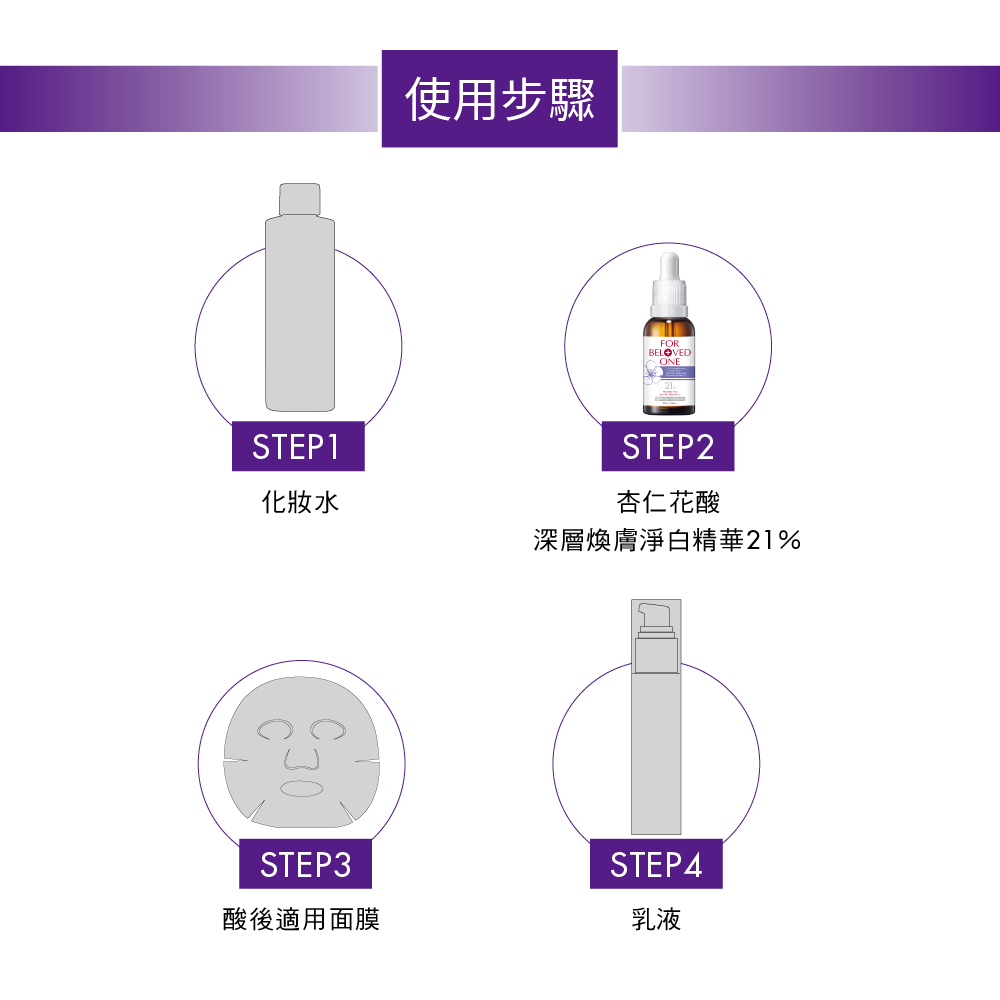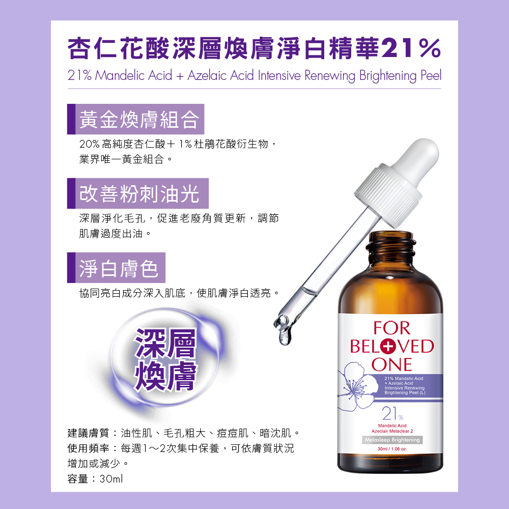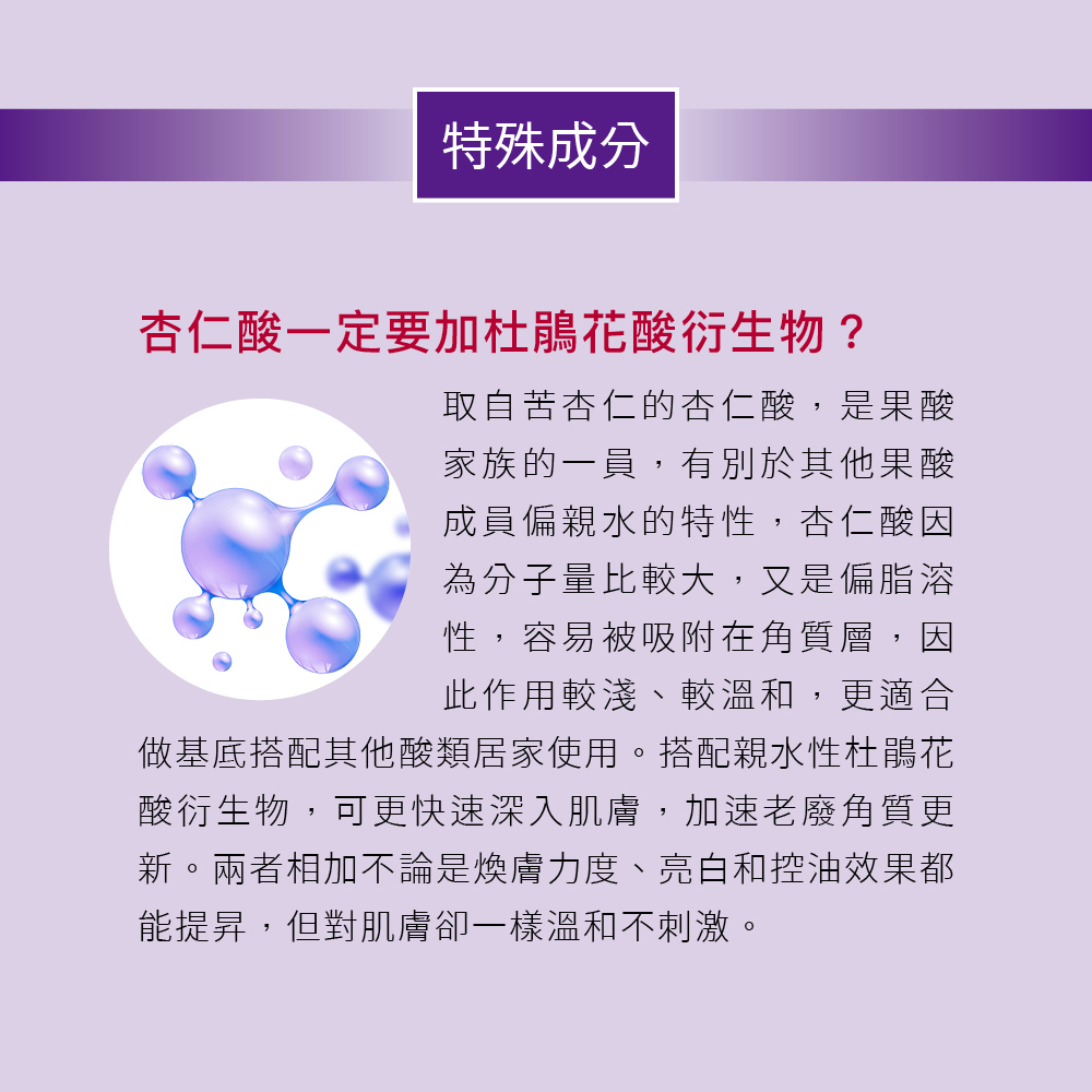 ①深層煥膚首選!20%高純度杏仁酸全新升級添加1%杜鵑花酸衍生物。