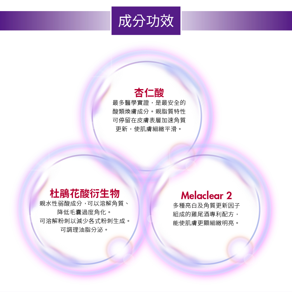 ②精萃高濃度杏仁酸結合杜鵑花酸衍生物,能促進老廢角質加速更新、深層淨化毛孔!