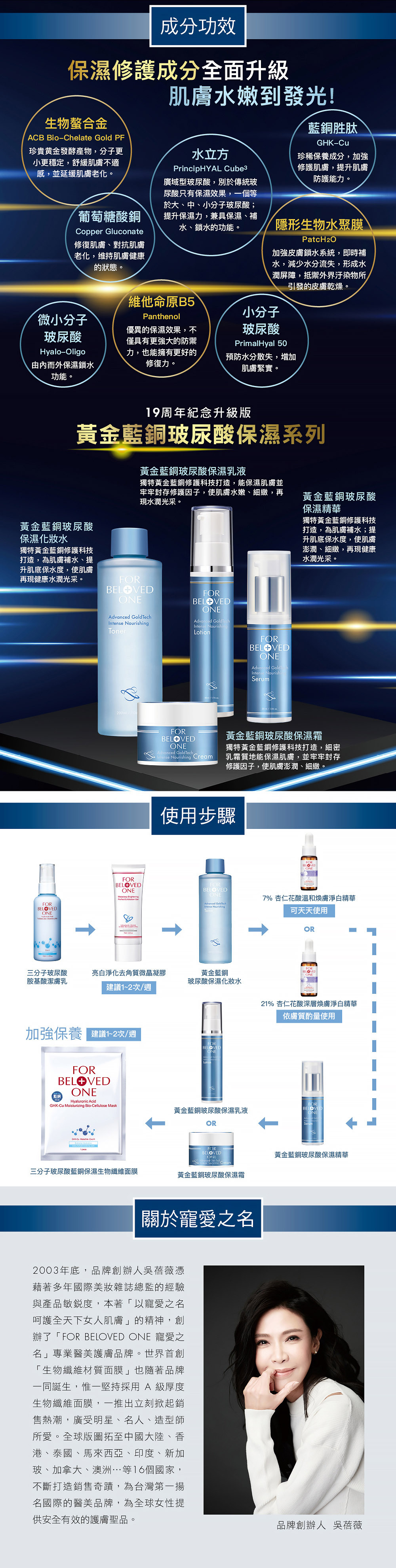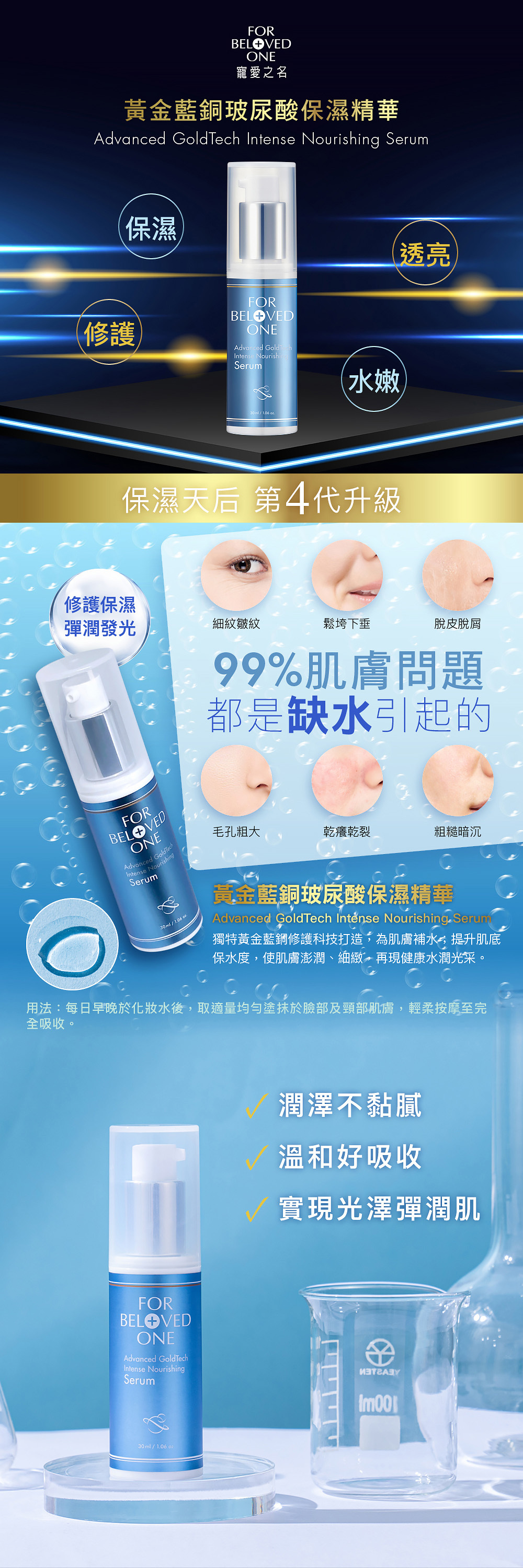 ①獨特黃金藍銅修護科技打造,為肌膚補水、提升肌底保水度